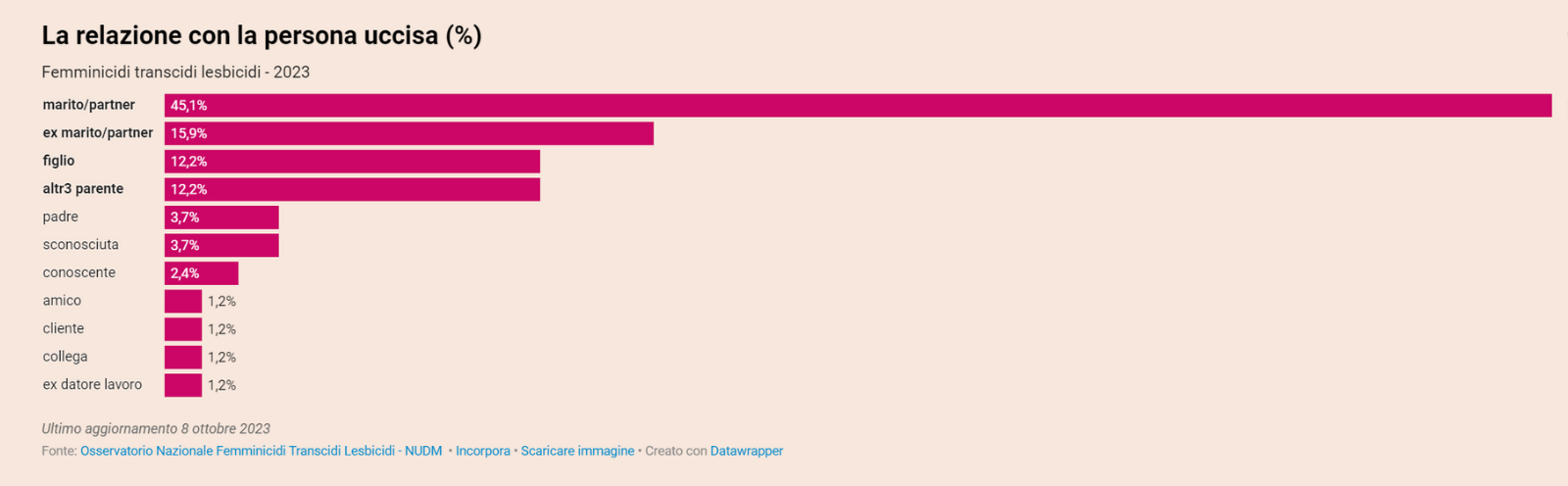 All’otto ottobre il numero totale di femminicidi ha infatti toccato quota 93. La vittima più giovane aveva solo 13 anni, l’assassino più giovane, al momento del delitto, 17. Nella quasi totalità dei casi, l’assassino era conosciuto dalla persona uccisa: in 37 casi l’omicida era il marito, il partner, il convivente. In 13 casi, a compiere il gesto è stato l’ex partner da cui la persona uccisa si era separata o aveva espresso l’intenzione di separarsi. Negli altri casi la relazione con la vittima era: figlio, padre, cognato, genero, suocero, collega, conoscente, cliente.