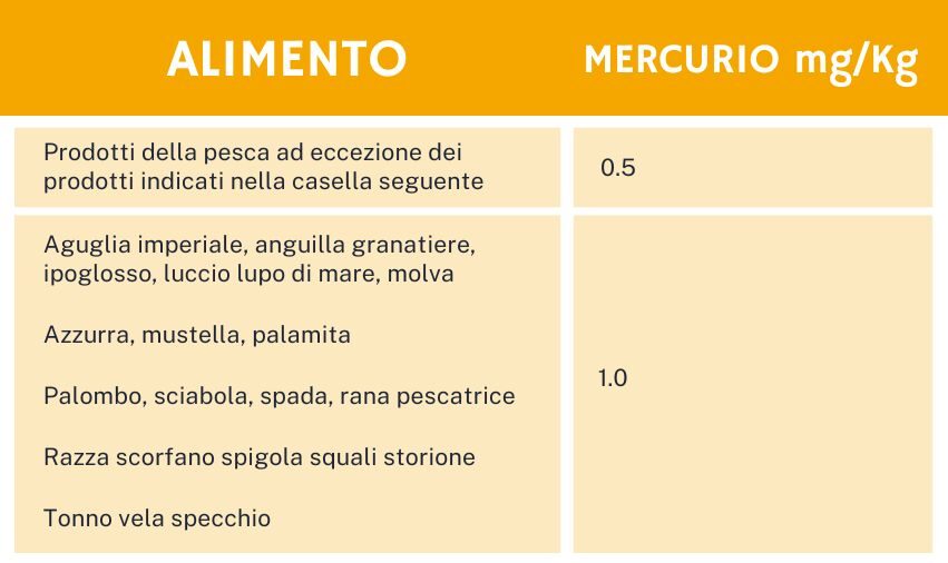 Può comportare alterazioni nello sviluppo cerebrale dei bambini e ad un livello più alto, alterazioni neurologiche negli adulti. La fonte principale di assunzione è il pesce ed i prodotti della pesca. Quanto mercurio si può ritrovare nel pesce e nei prodotti di mare? Studi e rilevazioni degli ultimi anni hanno denunciato purtroppo dei livelli di mercurio nel pesce che sono molto preoccupanti perché superiori ai limiti imposti dalla legge. La situazione è particolarmente preoccupante per la salute fetale e dei neonati. Va considerato che i pesci più grandi di dimensioni che vivono nel mare, come ad esempio il tonno e il pesce spada, sono quelli che contengono i maggiori quantitativi di metalli pesanti nelle loro carni, dato che sono pesci che vivono più a lungo e trascorrono più tempo in mare, con un ciclo di vita quindi più esteso rispetto a quello dei pesci di piccola taglia come le sardine, alici, sgombri ecc. Vivendo più a lungo in mare incamerano più metalli pesanti. In particolare il tonno a pinna gialla, quello che si utilizza a livello industriale per produrre il tonno in scatola, è la specie di tonno di taglia più grande, quella che dovremmo cioè evitare del tutto o mangiare molto poco. Attenzione infatti: l’OMS raccomanda un quantitativo massimo settimanale di 340 grammi a settimana di tonno in scatola, per gli adulti, e di 170 grammi per i bambini. Se acquistiamo invece dei piccoli tonnetti in pescheria, come la palamita e simili, questi sono molto meno contaminati e si possono mangiare con più tranquillità.
