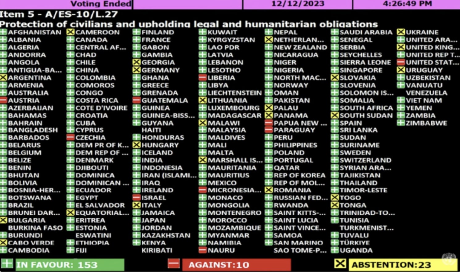 Tra i 10 Paesi che hanno votato contro si contano, insieme a Stati Uniti e Israele, anche Austria, Repubblica Ceca, Guatemala, Liberia, Micronesia, Nauru, Papua Nuova Guinea e Paraguay. L’Italia è tra i 23 astenuti, insieme alla Germania e ad altri Paesi Membri dell’Unione europea (Lituania, Olanda, Bulgaria, Romania, Ungheria, Slovacchia). Tra gli astenuti vi sono poi Ucraina e Regno Unito, oltre ad Argentina, Capo Verde, Camerun, Guinea Equatoriale, Georgia, Malawi, Isole Marshall, Palau, Panama, Sud Sudan, Togo, Tonga e Uruguay.
