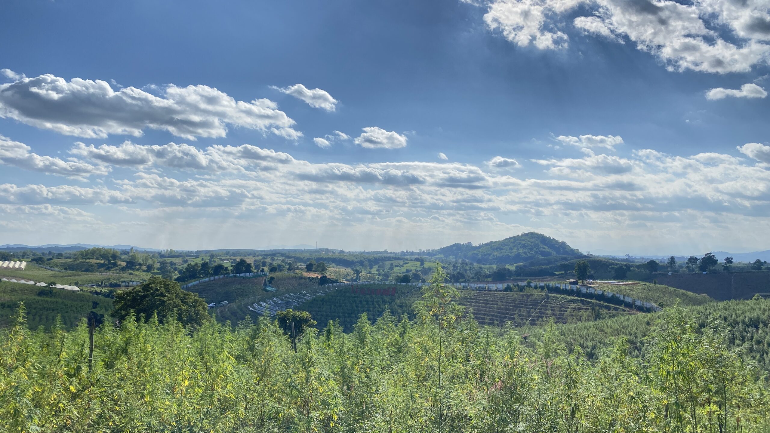 Sarà forse per questo motivo che quando giungo all’entrata dell’azienda agricola, i cancelli spalancati invitano ora i più curiosi ad avvicinarsi senza timore. Parcheggio il motore al fianco del casolare principale, decisamente di nuova fattura e invano, tento un timido saluto in lingua thai che, ahimè, si perde nel vuoto. Al che, mi faccio permesso da solo. Salgo le scale e la vista che si apre dalla terrazza panoramica è qualcosa di stupefacente: con la sua ventina di metri circa, un’indistinguibile foglia a cinque punte spicca con fierezza sull’apice del colle più alto. Non faccio in tempo a realizzare l’accaduto che, dirimpetto al megalite verde, vedo campeggiare la scritta ไร่อารมณ์ดี – in thai, la piantagione del buonumore – in un sfarzosissimo stile hollywoodiano. La paura frutto del periodo repressivo sembra aver ceduto il passo a un forte sentimento di rinascita e orgoglio, sfregiato e condiviso a quanti più occhi possibili.