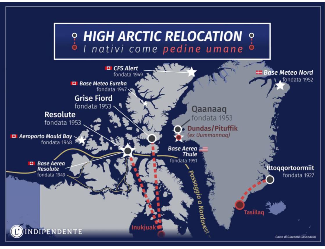 Nel 1953, gli stessi anni della costruzione della base aerea di Thule in Groenlandia, il Canada approntò il trasferimento di 92 Inuit dal nord del Québec verso Grise Fiord e Resolute, due villaggi costruiti appositamente 1.800 km più a nord, rispettivamente sull’isola di Cornwallis e sull’isola di Ellesmere. Lo scopo sarebbe stato quello di aiutare la popolazione a ricevere maggiori servizi dal governo e a prosperare in aree “ricche di opportunità di caccia”. Le due isole, tra le più settentrionali ed inospitali dell’arcipelago, non contavano sulla presenza di nessun insediamento umano: le condizioni meteo e la scarsità di fauna non erano adatte a sostenere lo sviluppo nemmeno di una comunità di Inuit, maestri nello sfruttare le risorse di territori durissimi.