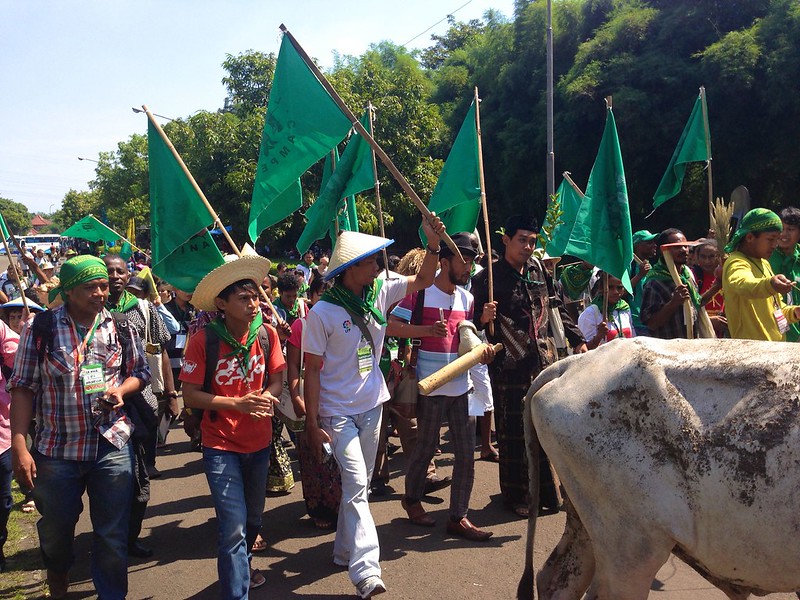 [Una manifestazione degli agricoltori di Via Campesina in Indonesia (foto di Global Justice Now)]Il termine “sovranità alimentare” ha un significato ben preciso, che fa riferimento al diritto delle persone ad avere accesso a un cibo sano e culturalmente appropriato, prodotto con metodi sostenibili, e al diritto di ciascun popolo di definire i propri sistemi alimentari e agricoli. Secondo il modo di vedere de La Via Campesina, affinché chiunque abbia accesso a un cibo sano e prodotto in armonia con la natura, è necessario orientare i modi di produzione all’agricoltore. Di fatto, il concetto di sovranità alimentarenulla ha a che fare con la politica protezionista, come talvolta si confonde nel linguaggio politico e nei programmi dei partiti conservatori, ma piuttosto con la tutela del legame tra il cibo e la sostenibilità della produzione, intesa in termini di rispetto dell’ambiente e delle comunità, presenti e future. Alla base vi è il rispetto della sovranità dei popoli nella scelta delle proprie politiche alimentari, tanto di produzione quanto di consumo, senza costrizioni esterne legate a interessi privati e specifici, affinché siano in sintonia con il tessuto ecologico, economico e sociale e garantiscano l’accesso a un cibo sano, nutriente e culturalmente appropriato. Si tratta di un diritto sancito per la prima volta nel 1948, con l’art. 25 della Dichiarazione universale dei diritti dell’uomo. Tutelare la sovranità alimentare significa opporsi a quell’insieme di pratiche condotte dall’agroindustria e dalla Grande Distribuzione Organizzata (GDO), con il beneplacito dei governi nazionali e delle organizzazioni sovranazionali, tra le quali figurano le monocolture, l’utilizzo massiccio di prodotti chimici, gli allevamenti intensivi, la produzione di cibi ultra-processati e così via. Tali istituzioni veicolano quotidianamente la falsa verità per la quale gigantesche navi portacontainer, aerei e camion si muovono costantemente attraverso il globo per sfamare l’umanità: la cruda realtà, invece, è che mentre la copertura alimentare abbonda largamente in alcuni continenti (Europa e Nord America, dove milioni di tonnellate di cibo vengono sprecate ogni anno), non raggiunge gran parte del resto del globo. In aggiunta, per garantire il funzionamento di tale sistema le coltivazioni sono irrorate di fertilizzanti e pesticidi, che accelerano i tempi di produzione ma hanno effetti tossici non solo sull’ambiente, ma anche sulla salute delle persone. Garantire la sovranità alimentare di ciascun popolo è tra gli obiettivi primari, se non il principale, del movimento de La Via Campesina. Per raggiungerlo, esso si mobilita sostenendo riforme agrarie nei territori contadini e fornendo formazione sui metodi di produzione agro-ecologici. Dalla data della sua nascita, il movimento si è seduto ai tavoli di discussione con la FAO (l’Organizzazione delle Nazioni Unite per l’alimentazione e l’agricoltura), con rappresentanti della società civile e delle organizzazioni indigene, con il Comitato per la sicurezza alimentare mondiale (CFS) e molte altre. È proprio grazie a questo incessante lavoro che è stata redatta la Dichiarazione delle Nazioni Unite sui diritti dei contadini e altre persone che lavorano nelle aree rurali (UNDROP), adottata dall’Assemblea generale delle Nazioni Unite nel 2018. Il documento costituisce un passo fondamentale per «l’affermazione dei diritti contadini e la ri-democratizzazione degli spazi legislativi», tramite l’inclusione dei produttori e dei lavoratori nei processi politici e legislativi.