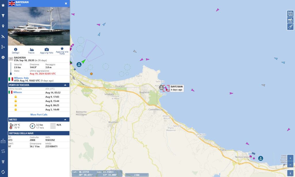 Il Bayesian issava la bandiera inglese, ed era gestito dai charter Campbell e Nicholson ma intestato alla Revtom, società con sede nell’Isola di Man e intestata ad Angela Bacares, 57 anni, moglie di Lynch, con lui a bordo del veliero e tra i sopravvissuti al naufragio. Dal Regno Unito è stato annunciato l’arrivo di una task force della Marine Accident Investigation Branch, una sorta di FBI marittima che nel mondo accerta e indaga ogni incidente o naufragio in cui siano coinvolti scafi UK. La sensazione di un commissariamento investigativo è palpabile.