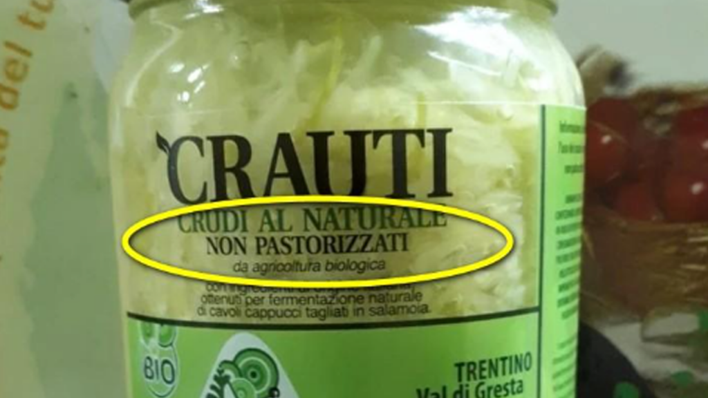 Alcuni formaggi e salumi sarebbero anch’essi lievemente probiotici, ma quelli commercializzati dall’industria purtroppo vengono in genere pastorizzati per renderli più facilmente conservabili ed evitare il rigonfiamento delle confezioni dovuto all’anidride carbonica. Perfino prodotti tradizionalmente probiotici, come le olive, i crauti, o i cetriolini in salamoia, quando vengono prodotti dall’industria sono spesso pastorizzati e così se ne azzerano i microrganismi vivi e le proprietà probiotiche. La pastorizzazione degli alimenti infatti distrugge non solo tutta la flora batterica presente su un alimento, ma anche gli enzimi dell’alimento stesso (importantissimi per la funzione digestiva e non solo) e alcuni tipi di vitamine come la vitamina C. Ecco perché abbiamo spiegato anche in altri articoli che acquistare miele pastorizzato o succhi di frutta pastorizzati (proprio quelli che troviamo al supermercato) non abbia alcun vantaggio per la nostra salute, ma semmai solo svantaggi. Se siete interessati ad acquistare dei veri crauti o altri cibi fermentati, verificate sempre sul vasetto che vi sia la dichiarazione e la dicitura “non pastorizzato”. Normalmente nei supermercati tradizionali è in vendita una versione dei crauti che è stata pastorizzata e la pastorizzazione non viene mai menzionata sulla confezione (cioè quando è pastorizzato non viene detto sulla confezione). Nei negozi e supermercati biologici, al contrario, la norma è che i crauti e le altre verdure fermentate non vengono mai pastorizzati (proprio per garantirne il loro potere probiotico effettivo) e questo aspetto viene sempre riportato sulla confezione.