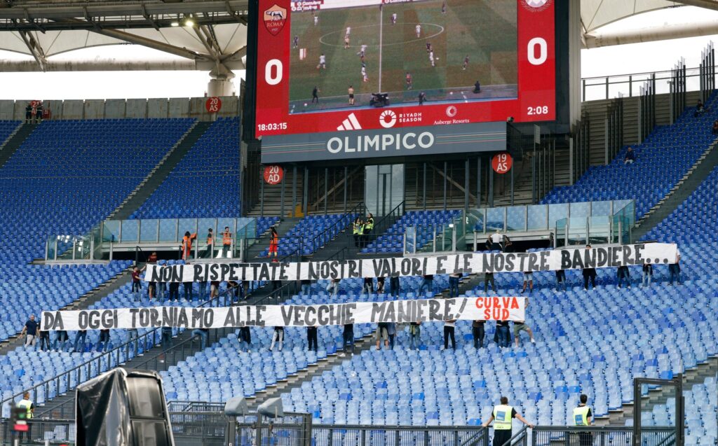 «Chi ama la Roma entra mezz’ora dopo» recita uno striscione esposto fuori all’Olimpico dai tifosi della Curva Sud. È soltanto uno dei tanti tasselli che ha dato forma alla protesta messa in piedi dopo l’esonero di Daniele De Rossi, bandiera giallorossa con 616 presenze all’attivo da calciatore. L’anno scorso era subentrato allo Special One Josè Mourinho nella sua prima avventura da allenatore. Il ritorno a casa ha comportato entusiasmo tra i tifosi e buoni risultati sul campo. Arriva dunque il rinnovo fino al 2027 da dieci milioni di euro netti, a cui fa seguito l’acquisto di nuovi giocatori congeniali al gioco di De Rossi – nonostante i paletti economici sbandierati fino a pochi mesi prima durante la gestione Mourinho. Come un fulmine a ciel sereno il 18 settembre avviene lo strappo totale della dirigenza statunitense dei Friedkin che, dopo appena quattro giornate di campionato (senza vittorie), decide di esonerare l’allenatore. In un clima surreale si arriva dunque al match con l’Udinese. Per la prima mezz’ora la Curva Sud resta deserta, in compagnia di uno striscione rivolto ai proprietari: «Non rispettate i nostri valori e le nostre bandiere… Da oggi torniamo alle vecchie maniere». Di tutto questo né su Sky né su Dazn – detentrici dei diritti tv della Serie A – c’è traccia. Non si spiegano né i motivi della curva vuota né del suo improvviso riempimento: la protesta dei tifosi è silenziata, si evita quindi di amplificare la loro voce scagliata contro uno dei padroni del calcio moderno, che oltre alla Roma possiede il Cannes e l’Everton, in uno dei tanti casi di multiproprietà.