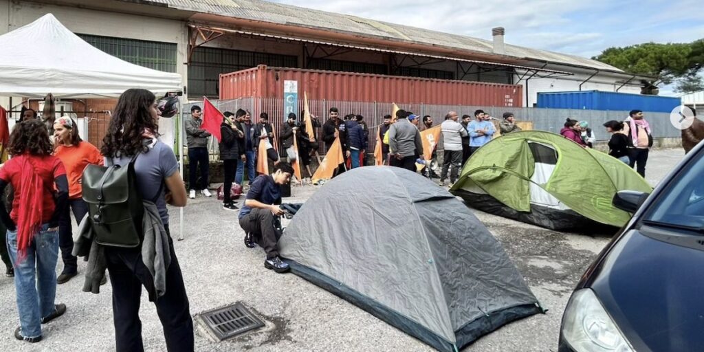 Picchetto davanti a una delle aziende del distretto tessile di prato lo scorso 6 ottobre. Lo sciopero è stato indetto dal sindacato Sudd Cobas Prato-Firenze che si occupa della situazione dei lavoratori di aziende di questo tipo e di promuovere al loro interno le 40 ore di lavoro settimanali