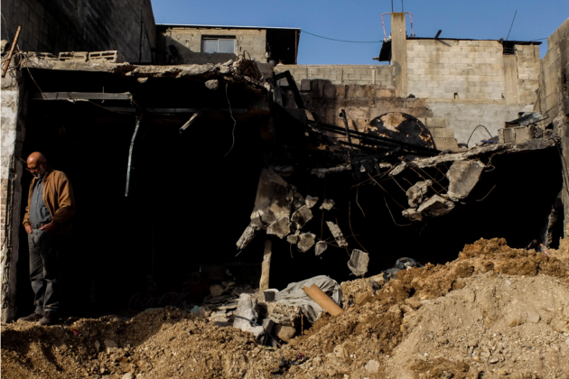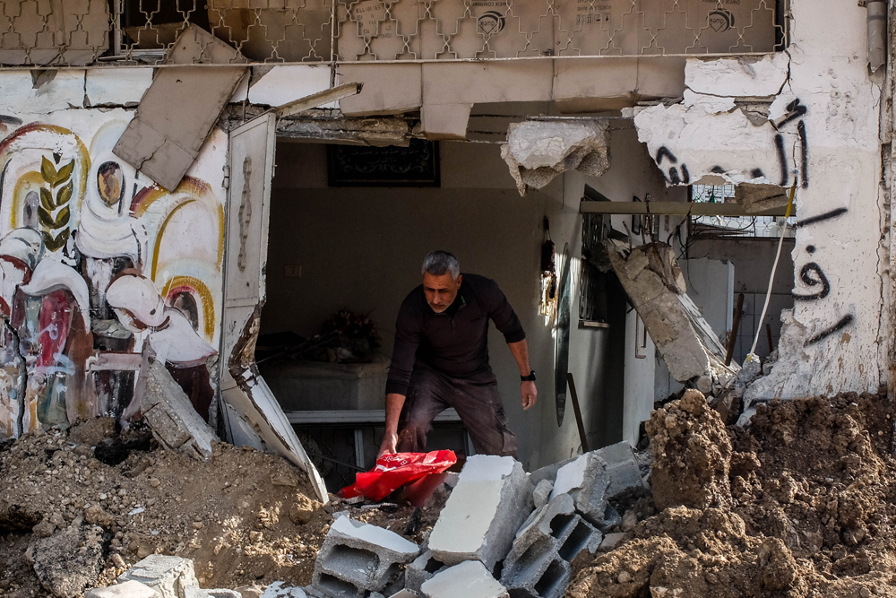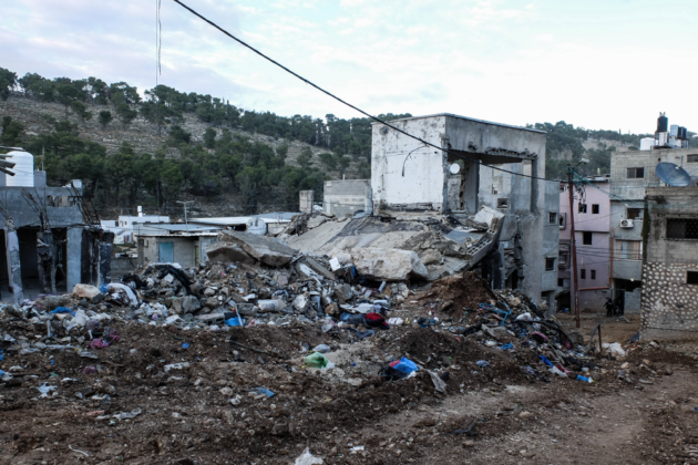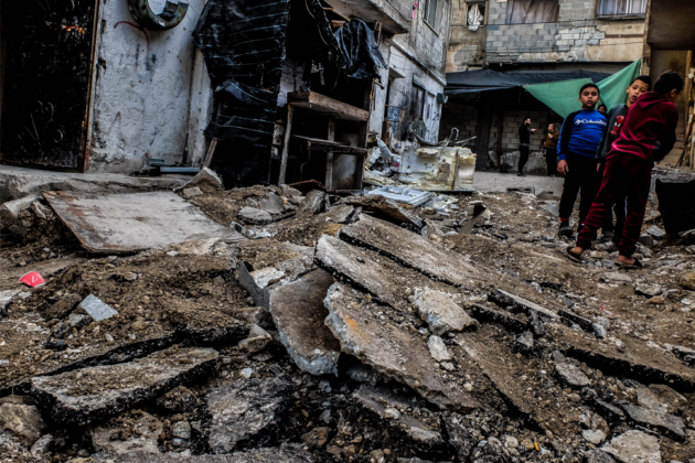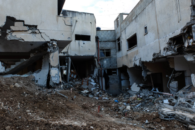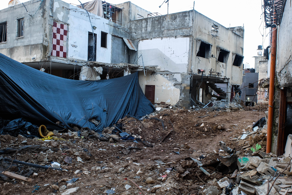 Incontriamo altri giovani radunati intorno un piccolo fuoco. Alcuni sono membri della resistenza, gli M-16 appesi lungo il fianco. «A lui hanno ucciso due fratelli. Per questo ha preso le armi», dice Ahmad, accennando a un ragazzo che avrà poco più di vent’anni, uno sguardo molto serio e profondo. Un ragazzo ci porta a vedere la sua casa, o meglio, ciò che ne resta. «Attenzione, è pericolante» dice. I mobili che restano sono mezzo bruciati, una parte della casa è crollata e l’altra deve aver preso fuoco. Il soffitto e le pareti sono tutte nere di fuliggine. «Hanno messo una bomba e l’hanno fatta esplodere quando se ne sono andati», ci dice. «Si era appena sposato!» aggiunge un altro ragazzo, indicando il proprietario di casa. «Ma c’è una parte del campo che è la più distrutta di tutti. È come Gaza», dice. Andiamo. Usciamo dalla zona dei teli, nemmeno duecento metri e si apre uno scenario apocalittico. Non c’è vita in quella zona di case. Non c’è nessuno, e non c’è più ragione per starci. È tutto distrutto: saranno almeno una decina di edifici completamente devastati. Mura distrutte, case crollate, la strada di terra e fango ha ancora i segni freschi dei D9 che l’hanno calpestata. «Questa era una scuola dell’UNRWA» mi dice Ahmad, indicando un edificio a pezzi, completamente inagibile. «E qua hanno fatto saltare una casa per poter entrare coi mezzi direttamente fino alla strade interne» racconta il nostro nuovo accompagnatore.