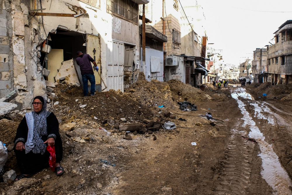 «Quella era una farmacia, quella una struttura dell’UNRWA» dice Ahmad, un abitante del campo che ci accompagna indicando due edifici gravemente danneggiati. E ancora: case senza un pezzo di parete, pilastri rotti che sembrano reggere per miracolo il piano soprastante. Le macerie sono accumulate al centro della piazza, mischiate alla terra e a pezzi di asfalto dei raid precedenti. Intanto, intorno si vedono famiglie al lavoro: chi aggiusta una porta, chi mette del nylon a una finestra, chi sta già ricostruendo il muretto distrutto con mattoni e cemento. Un ragazzo sta rimettendo in piedi il suo baracchino di legno da cui vendeva il caffè. «E se me lo distruggono un’altra volta, lo ricostruirò di nuovo» dice, quasi per confermare la forza e resistenza di quel popolo sotto occupazione da ormai 76 anni.