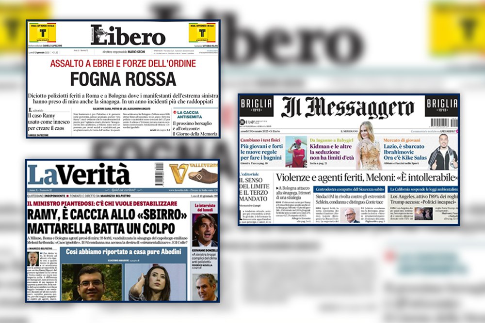 Nonostante tali precisazioni, il danno è stato fatto. L’ambasciatore d’Israele in Italia, Jonathan Peled, ha definito gli scontri «un grave attacco antisemita». Media e politici hanno cavalcato la notizia di una presunta offensiva anti-ebraica, alimentando un’ondata di indignazione basata su informazioni errate. Prova ne sono le prime pagine dei giornali – sia le edizioni cartacee che quelle online – del 13 gennaio: «Pretesti, non proteste. Nel corteo per Ramy vandalizzata la sinagoga a Bologna», il titolo di un articolo sul Foglio; «Vandalizzata la sinagoga del capoluogo emiliano», si è letto su La Verità; «Bologna, bombe carta e devastazioni: attacco alla sinagoga», scriveva Tgcom24; «A Bologna attacco alla sinagoga. I timori di una strategia», il titolo di un pezzo posizionato in prima pagina su Il Messaggero; «L’assalto alla sinagoga di Bologna ha una logica: la lotta al sistema liberal capitalistico occidentale», titolava l’editoriale di Andrea Cangini sull’Huffington Post; «Bologna, atti vandalici anche alla Sinagoga durante il corteo per Ramy», scriveva RaiNews24; «Scontri a Bologna a corteo Ramy, vandalizzata la Sinagoga: ira del sindaco», il titolo dell’AdnKronos. E così via, fino ad arrivare al titolone di prima pagina di Libero: «Fogna Rossa – diciotto poliziotti feriti a Roma e Bologna dove i manifestanti di estrema sinistra hanno preso di mira anche la sinagoga».