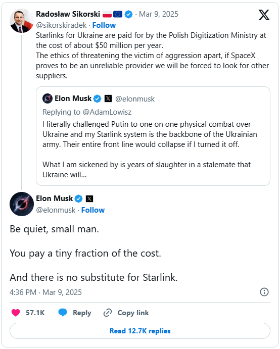 Attraverso il suo social, X, Musk ha infatti osservato recentemente che la resistenza ucraina all’invasione russa collasserebbe, qualora i servizi satellitari elargiti da Starlink venissero meno. Un’affermazione che, nel contesto, è stata percepita come minaccia tutt’altro che velata, ancor più perché l’azienda aveva già in passato oscurato l’accesso alla Rete alle truppe di Kiev. Radosław Sikorski, Ministro degli Esteri polacco, ha reagito all’uscita facendo notare che il servizio satellitare fornito all’Ucraina sia pagato anche dal Ministero della Digitalizzazione polacco, quindi ha descritto l’imprenditore come “un fornitore inaffidabile”. “Stai zitto, ometto”, gli ha risposto Musk, “pagate una frazione minuscola del costo. E non c’è sostituto per Starlink”.