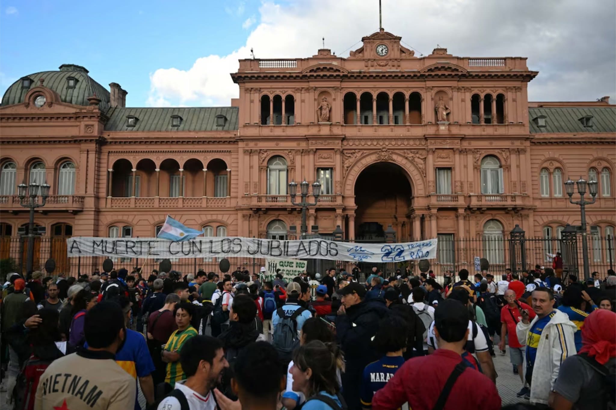 «A muerte con los jubilados» (morire al fianco dei pensionati). Parla chiaro lo striscione issato sui cancelli della Casa Rosada, sede del potere esecutivo argentino, che richiama la presa di posizione assunta ai tempi da Diego Armando Maradona. «Hay que ser muy cagón para no defender a los jubilados. Lo que les hacen es una vergüenza» (si deve essere vigliacchi per non difendere i pensionati. Ciò che gli stanno facendo è una vergogna), dichiarò nel 1992 El Pibe de Oro, in occasione di una massiccia mobilitazione dei pensionati, minacciati da alcune misure governative.