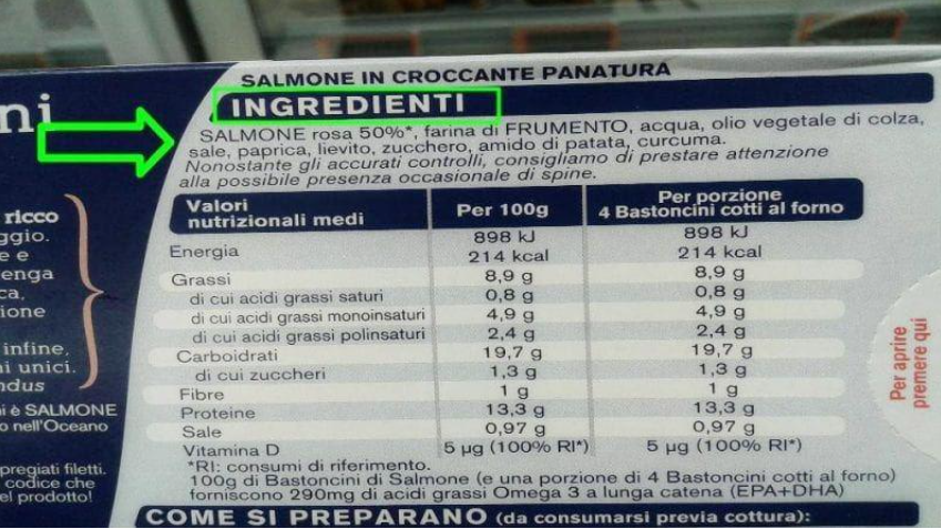 Analizziamo oggi questi prodotti, in particolare gli amati bastoncini (di merluzzo, salmone), disponibili di varie marche nel reparto surgelati del supermercato. Questi prodotti i bambini li mangiano perché l’industria sa come prendere i piccoli per la gola, aggiungendo nella panatura delle sostanze altamente palatabili (saporite) che sono gradite al gusto. Purtroppo le sostanze che aggiunge l’industria sono però di bassa qualità nutrizionale e spesso anche poco salutari, come ad esempio lo zucchero, l’olio di colza, oppure il sale, che viene aggiunto a quantitativi piuttosto elevati. Ma c’è dell’altro: la prima cosa importante che tutti i lettori dovrebbero tenere a mente a proposito di questi prodotti, è la seguente: quando acquistiamo questi bastoncini, in pratica stiamo acquistando solo il 50% di pesce e il rimanente è farina, acqua, olio, amido, zucchero e sale. A seconda della marca e della tipologia di pesce, si può arrivare al 60% di pesce, ma non oltre.