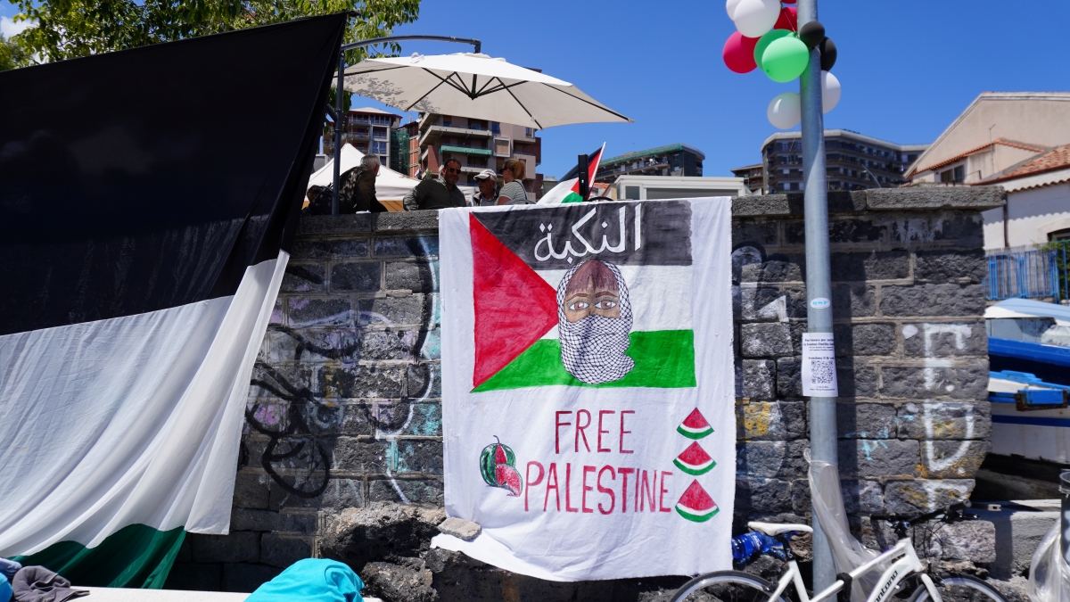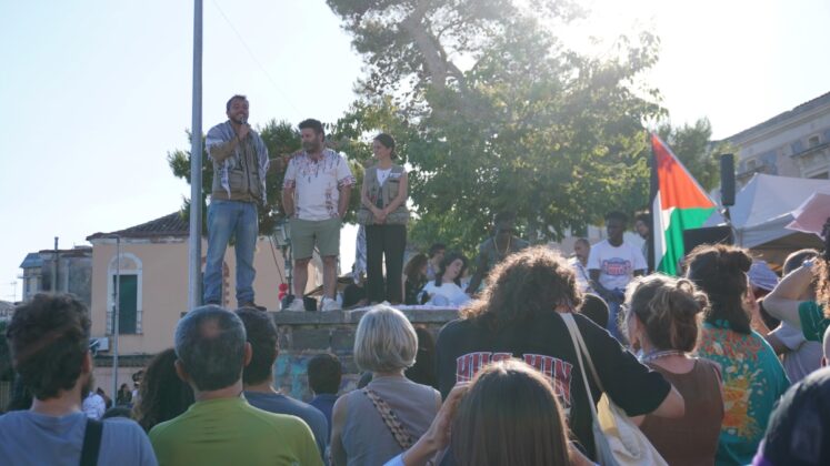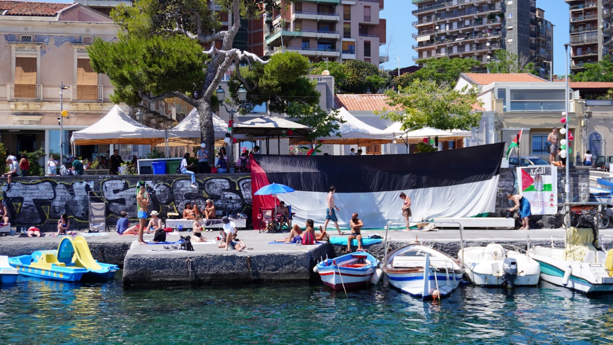 E visto dal porto di San Giovanni Li Cuti appare evidente che Yazin abbia ragione. I cittadini sono con loro e sopra i tavoli dei ristoranti ci sono palloncini rossi, neri, verdi e bianchi: i colori che compongono la bandiera palestinese. Mentre i passanti si fermano ad ascoltare ed applaudire. «Hanno ragione, è ora di fare qualcosa per fermare Israele», dice ai clienti il ragazzo che lavora al chiosco mentre serve caffè e birre. Tanti chiedono cosa possono fare dei semplici cittadini per fermare tutto questo. «La storia dimostra che l’azione collettiva è il vero motore dei cambiamenti reali», risponde Thiago dal palco: «partecipate alle proteste, attuate il boicottaggio verso i marchi complici del genocidio, supportate i gruppi che sabotano le industrie di armi e bloccano il loro trasporto dai porti, informatevi e invitate gli altri a fare lo stesso tra i vostri amici e su internet. Tutte le azioni sono parte della battaglia per fermare Israele. La grande maggioranza dei cittadini in Europa e nel mondo sta con la Palestina. Il problema è che i governi non rispettano la volontà dei cittadini che li hanno eletti, ma se saremo uniti e determinati dovranno farlo».