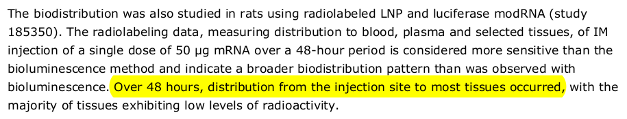 La cosa più sconcertante è che i produttori e le agenzie regolatorie erano consapevoli del rischio di biodistribuzione oltre il sito d’iniezione, come dimostra il report di valutazione dell’Agenzia Europea per i Medicinali (EMA), basato sullo studio Pfizer n° 185350 condotto su ratti10, che a pagina 47 afferma chiaramente: «In 48 ore, la distribuzione dal sito di iniezione alla maggior parte dei tessuti si è verificata» (Figura 1).