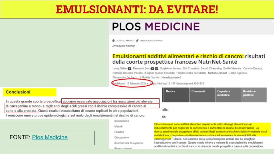 Ma c’è un problema: anche la carragenina è una sostanza sconsigliata nella dieta, sia dei bambini che degli adulti stavolta, in quanto è collegata negli studi a problemi di salute come tumori e diabete di tipo 2. Il meccanismo attraverso il quale si arriva allo sviluppo di tumori e diabete nell’uso di questo tipo di additivi è collegato agli effetti deleteri che gli emulsionanti come la carragenina esercitano sul microbiota intestinale (cioè i batteri dell’intestino) e all’infiammazione che tali additivi determinano nell’organismo. Queste non sono solo mere ipotesi ma conclusioni scritte nere su bianco in diversi studi scientifici effettuati ad oggi su queste sostanze, come ad esempio questo studio molto esteso effettuato in Francia e pubblicato nel febbraio 2024 sulla rivista Plos Medicine.