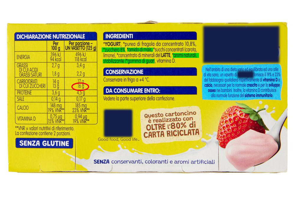 Una terza categoria di prodotti per la colazione o la merenda dei bambini su cui il marketing alimentare ha investito tantissimo sono gli yogurt, che però sarebbe meglio definire pseudo-yogurt, in quanto non si tratta mai, a ben guardare, di veri yogurt ma di preparazioni dolciarie a base di yogurt. E anche in questo caso la costante negativa è l’aggiunta di zucchero a quello che potrebbe semplicemente essere un alimento naturale. Nel caso che vi mostro ho scelto un prodotto al gusto di fragola, pertanto anziché vedere solo yogurt e fragole nella lista ingredienti, ci si ritrova in aggiunta anche zucchero, aromi, stabilizzanti, amido di mais, concentrato di minerali del latte. Ma se lo yogurt è presente nel prodotto, perché aggiungere dei minerali del latte? Evidentemente quello yogurt è molto poco, oppure ha perso con il processo di lavorazione alcune sostanze importanti (come minerali e vitamine). Da segnalare che in questo prodotto è stato aggiunto tanto zucchero da far lievitare il contenuto complessivo a ben 16 grammi (ovvero 4 cucchiaini) per un vasetto da 125 grammi, mentre uno yogurt naturale ne avrebbe appena 4 grammi. Quattro volte più zuccheri, insomma.