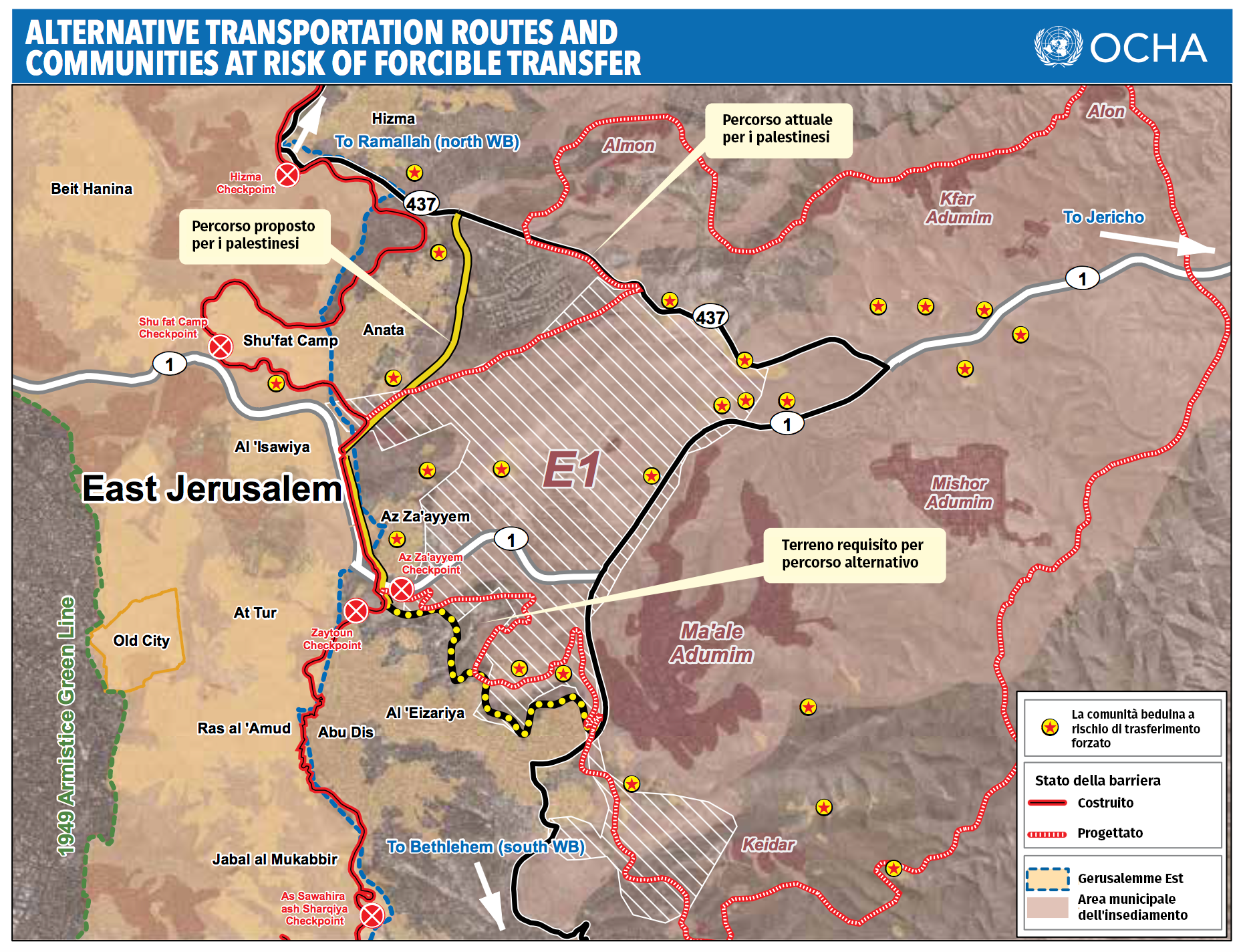 Il piano di insediamento E1 (sigla che sta per East 1) prevede la costruzione di 3.412 abitazioni all’interno di un’area di 12mila dunam (corrispondenti a 12 chilometri quadrati) a nord e a ovest della strada che collega Gerusalemme a Maale Adumim (a 6km da Gerusalemme), una delle colonie più estese e popolate della Cisgiordania. Il progetto prevede l’edificazione di tre quartieri residenziali e aree destinate a commercio, industria e alberghi. L’area designata collegherebbe giuridicamente e urbanisticamente la parte orientale di Gerusalemme a Maale Adumim, isolando i quartieri palestinesi di Gerusalemme Est dalle aree della Cisgiordania non occupate, e separando di fatto Betlemme, la stessa Gerusalemme Est e Ramallah. La zona interessata è abitata da 18 comunità beduine che rischierebbero di venire sfollate. Finora sono stati pianificati due quartieri residenziali, dove Israele costruirebbe le oltre 3.000 abitazioni in programma; il terzo quartiere residenziale, che collegherebbe gli altri insediamenti a Gerusalemme, e la zona commerciale-industriale sono congelati per motivi urbanistici.