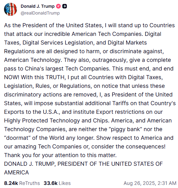 Pochi giorni più tardi, il 26 agosto, Donald Trump ha alzato ulteriormente i toni sul suo social network Truth Social: «in qualità di Presidente degli Stati Uniti, terrò testa alle nazioni che attaccano le nostre strepitose aziende tech americane», ha scritto richiamando esplicitamente il DSA e il DMA. «Avviso tutte le nazioni con tasse digitali, legislazioni, regole e regolamenti che, qualora queste misure discriminatorie non vengano ritirate, in qualità di Presidente degli Stati Uniti, imporrò ulteriori tasse consistenti sulle esportazioni di queste nazioni verso gli USA e limiterò le esportazioni nei loro confronti della nostra tecnologia protetta e dei chip».