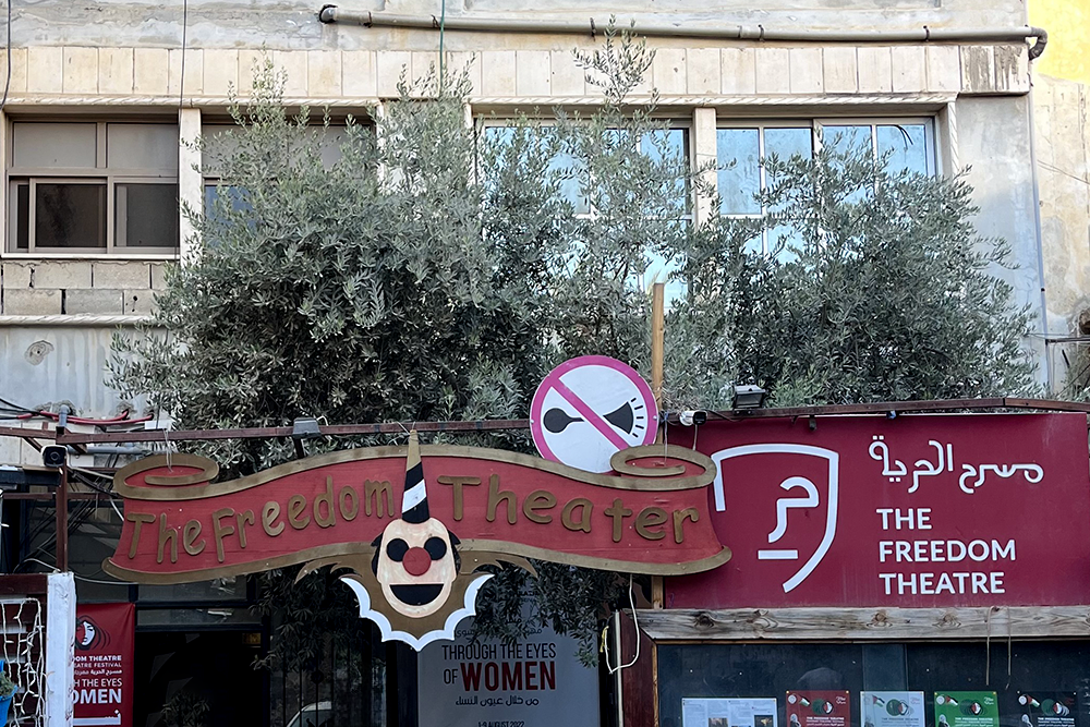 L’insegna del Freedom Theatre, il teatro fondato dall’attivista pro palestinese israeliana Arna Mer-Khamis. Un luogo nato con lo scopo di dare ai bambini palestinesi un luogo dove poter immaginare qualcosa di diverso dalla guerra