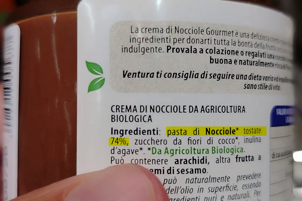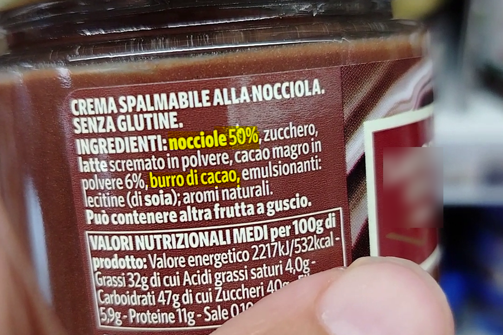 Il contenuto di nocciole è determinante anche per capire se il prodotto è troppo ricco di zucchero, oli aggiunti e additivi vari, come gli emulsionanti. Infatti possiamo vedere che nei prodotti in cui troviamo lo zucchero al primo posto della lista ingredienti, vengono inseriti anche oli raffinati, aromi ed emulsionanti, sostanze di cui sarebbe bene fare a meno perché vanno a detrimento della nostra salute. Dato che le nocciole sono poche, bisognerà aggiungere olio (per rendere il prodotto cremoso e spalmabile) emulsionanti (per aumentare cremosità e miscelabilità degli ingredienti) e aromi per restituire gusto che manca a causa del basso quantitativo dell’ingrediente di base (nocciola).