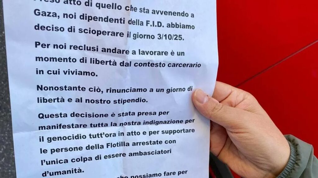 Un particolare che rende l’idea di come lo sciopero odierno stia mobilitando ampie fasce della popolazione anche al di fuori dei lavoratori delle categorie solitamente interessate dalle proteste sindacali. Dal carcere della Dozza, Bologna, ci arriva l’immagine del volantino con il quale i detenuti che godono del permesso di lavoro come dipendenti della società Fare impresa in Dozza (FID) annunciano l’intenzione di rimanere in cella per protestare contro il genocidio in Palestina e il blocco della Global Sumud Flotilla: «Per noi lavorare è un atto di libertà. Nonostante ciò, rinunciamo a un giorno di libertà e al nostro stipendio», hanno scritto i carcerati.