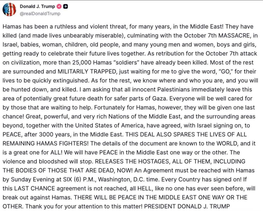 Il presidente degli Stati Uniti Donald Trump ha pubblicato un post sulla propria piattaforma social Truth in cui dà un ultimatum ad Hamas per accettare il proprio piano di pace. Trump ha detto che Hamas ha tempo fino alle 18 di domenica (le 12 italiane) per fornire la propria risposta, altrimenti “tutto l’inferno, come mai nessuno lo ha visto prima, sarà scatenato contro Hamas”.