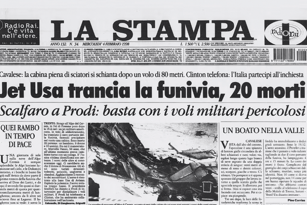 Nel 1998, Aviano era il trampolino della NATO e delle forze USA per controllare i cieli della Bosnia, dopo che gli accordi di Dayton hanno lasciato spazio all’operazione Deliberate Guard, una sorta di pattugliamento aereo per garantire stabilità e sicurezza in quelle regioni dilaniate dalla guerra nei Balcani. L’anno successivo, tuttavia, dopo le recrudescenze e la spirale di tensioni, dalla stessa base di Aviano decollavano i bombardieri diretti a martellare Belgrado e la Serbia, nell’ambito dell’operazione Allied Force, nella quale il disinvolto utilizzo di bombe all’uranio impoverito ha causato malattie e morte anche tra diversi soldati del contingente italiano che ha utilizzato quei micidiali ordigni a sua insaputa. La necessità di addestrarsi ai voli in terra slava, da parte dei piloti americani di Aviano, li spingeva in quel periodo a utilizzare il cielo delle Dolomiti come una palestra naturale, sfruttando la conformazione orogeografica del territorio. Ma, molto spesso, in modo sconsiderato e pericoloso per la popolazione. I voli radenti, o a bassa quota, erano una consuetudine e un vizio dei piloti statunitensi, al punto che nella base avevano coniato il detto “sotto alle Alpi, ci sono le palme”. Evidente il significato: per i top gun del 31 Fighter Wing, la Val di Fiemme era come il deserto del Nevada: non c’era proprio nulla di cui curarsi, sotto alle ali dei loro jet. Nessuna considerazione né rispetto per la popolazione, i centri abitati e, soprattutto, la vita delle persone.