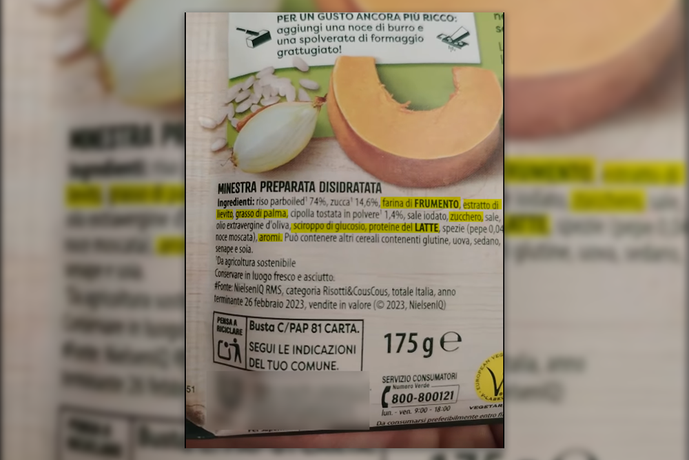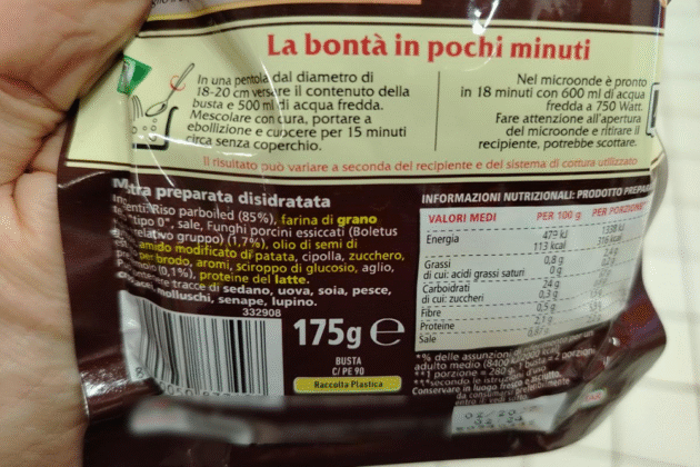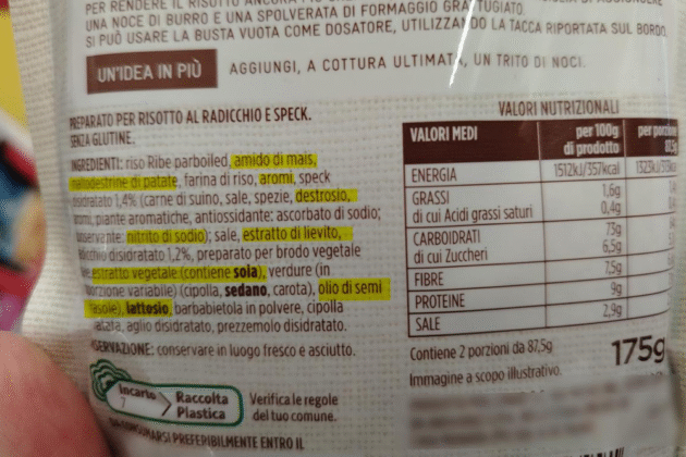 Alcune buste di risotti fra i più commerciali presenti al supermercato contengono persino della farina di frumento al loro interno, e dunque del glutine. Si tratta di un vero paradosso, dal momento che il riso è un cereale di per sé naturalmente privo di glutine (la proteina del grano). Un consumatore poco attento potrebbe acquistare queste buste sentendosi tranquillo e pensando di mangiare in fondo solo del riso. In realtà i prodotti più industriali e scadenti contengono sia frumento (quindi il glutine) che molti altri additivi e sostanze poco raccomandabili come: maltodestrine (zuccheri), amidi, zucchero, estratto di lievito (insaporitore), lattosio, estratto di soia, olio di semi di girasole, proteine del latte, sciroppo di glucosio, conservanti come i nitriti. Tutto ciò comporta che questi prodotti siano da considerare in tutto e per tutto parte dei cibi ultra-processati, che – come spiegato su L’Indipendente in un approfondimento – sono da considerare sempre insalubri e da consumare meno possibile.