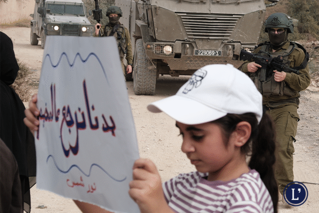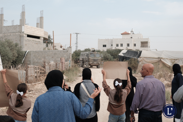 La piccola manifestazione parte in direzione del campo; nemmeno trecento metri dopo, due jeep militari ci vengono incontro e scendono vari soldati. Dai mezzi un militare tiene il fucile puntato sulla folla. Il messaggio è chiaro: se continuate a camminare, spariamo. Il gruppo, si ferma. «Quella è la mia casa» una donna indica la prima abitazione che sorge davanti a noi, dietro la linea degli israeliani. Gli occhi, neri, sono pieni di tristezza. «L’hanno resa una delle loro basi militari».