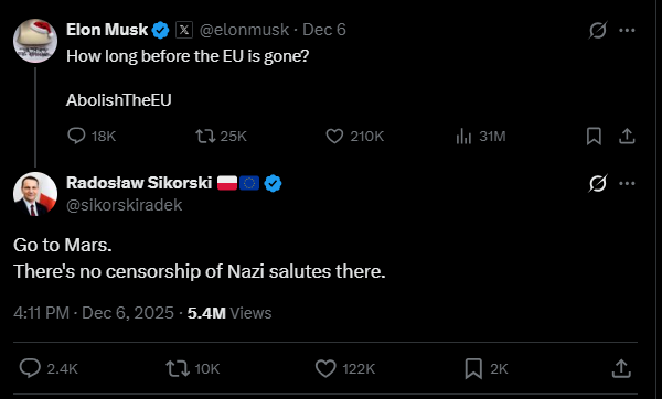 La reazione di Musk alla multa è stata immediata ed è stata trasmessa facendo leva sui suoi caratteristici canoni di pacatezza e diplomazia. Su X ha scritto: “L’UE andrebbe abolita per restituire la sovranità alle singole nazioni, così i governi potrebbero rappresentare meglio i propri cittadini”. Per rincarare la dose, ha accomunato l’Unione Europea al nazismo, supportando con un repost l’idea che Bruxelles sia ormai a capo di un “Quarto Reich”. A stretto giro è arrivata la replica di Radosław Sikorski, ministro degli Esteri polacco e già protagonista di scontri con Musk, il quale ha definito i discorsi antieuropei e sulla sovranità utili soltanto a chi “vuole trarre profitto diffondendo odio o a chi sogna di conquistare l’Europa”. Il politico ha poi invitato l’uomo a capo di X ad assecondare le sue fantasie esplorative spaziali e di trasferirsi su Marte, “dove non sono censurati i saluti nazisti”.