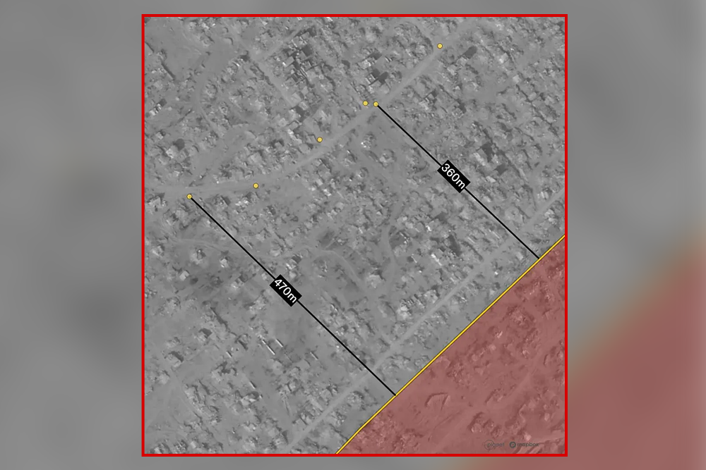 L’analisi delle immagini satellitari e i riscontri sul terreno indicano che la linea di controllo è stata progressivamente spinta più a ovest rispetto agli accordi iniziali, attraverso l’installazione di 27 blocchi di cemento gialli e nuovi posti di controllo a ovest, oltre il tracciato previsto. A Jabaliya un nuovo avamposto militare è sorto dopo lo smantellamento di un’area di tende sovraffollata e la demolizione degli edifici vicini. Al loro posto sono state scavate strade, realizzati terrapieni e costruite strutture militari, con berme fino a 75 per 65 metri. L’avamposto, edificato su un’altura, è visibile da ovest della linea gialla, oltre una fascia di territorio devastato da cui i palestinesi sono stati forzatamente allontanati. Questi elementi materiali di separazione, accompagnati da sbancamenti e lavori di ingegneria militare, mostrano come una linea dichiarata provvisoria stia di fatto assumendo il ruolo di confine stabile, con oltre la metà della Striscia sottoposta a controllo diretto israeliano.