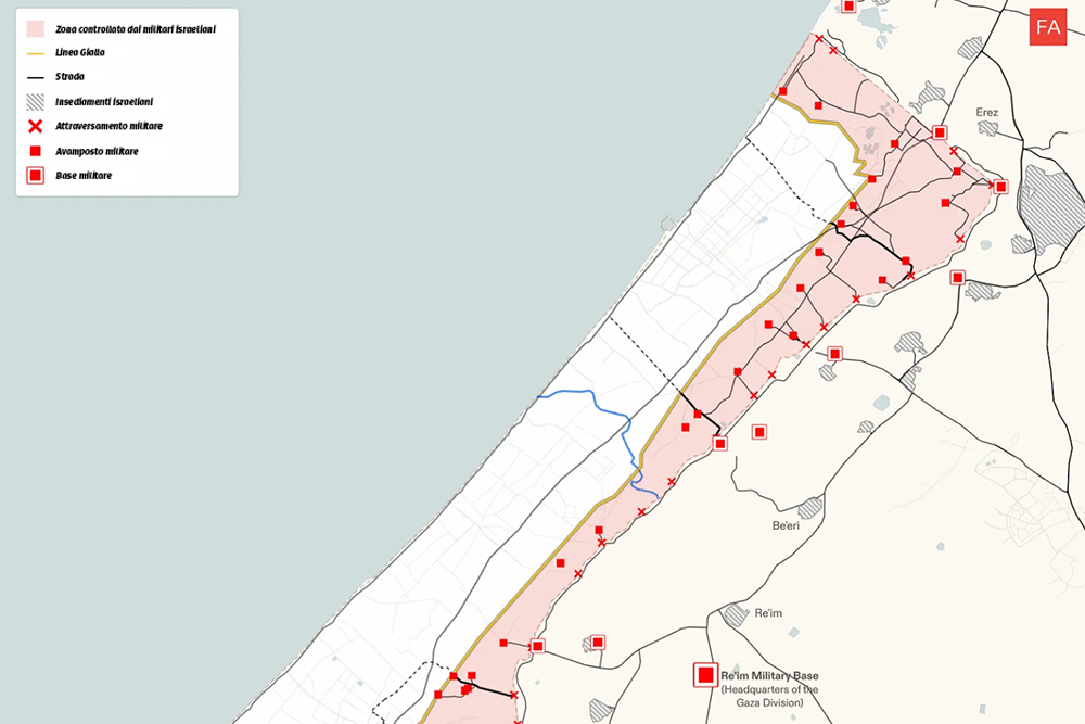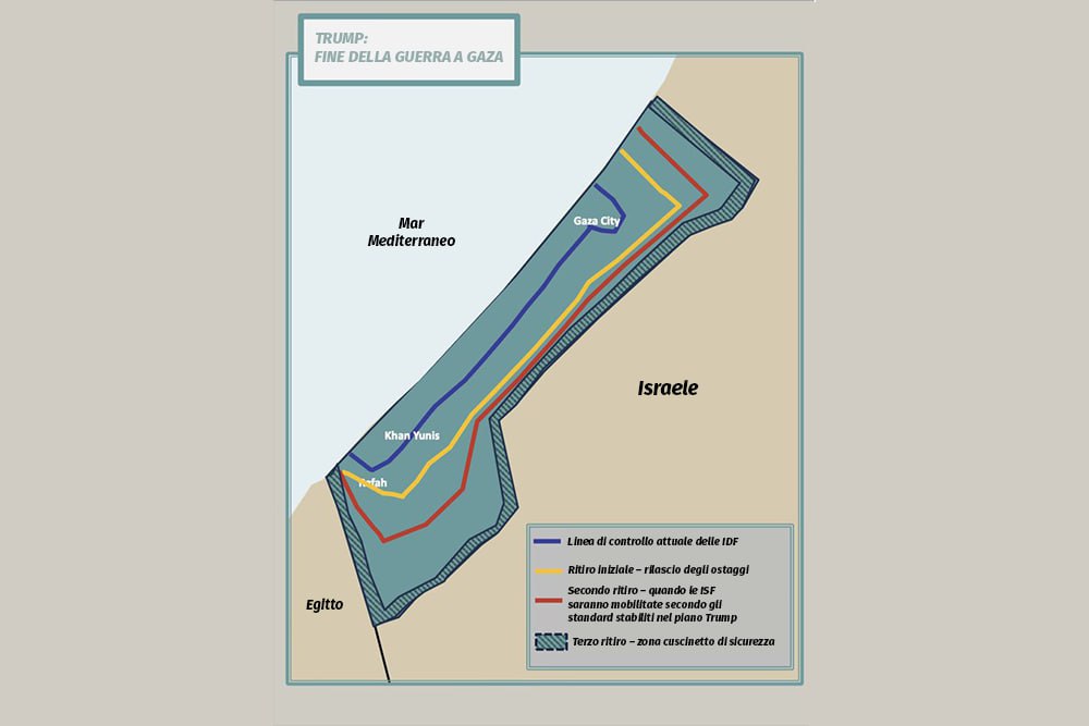 Come parte della fase iniziale dell’accordo di cessate il fuoco, l’esercito israeliano si è ritirato solo parzialmente lungo la cosiddetta “linea gialla”, mantenendo il controllo di oltre metà della Striscia di Gaza. La linea, prevista dal piano in 20 punti di Donald Trump, avrebbe dovuto segnare un ritiro graduale. Il punto 16 del piano americano afferma esplicitamente che «Israele non occuperà né annetterà Gaza. Man mano che la [Forza Internazionale di Stabilizzazione (ISF)] stabilirà il controllo e la stabilità, le Forze di Difesa Israeliane (IDF) si ritireranno in base a standard, traguardi e tempistiche legate alla smilitarizzazione». Il presidente americano aveva pubblicato una mappa che mostrava la linea di ritiro iniziale, che lasciava a Israele il controllo del 58% di Gaza. Dopo l’entrata in vigore del cessate il fuoco, un portavoce militare israeliano ha pubblicato un’altra mappa con la linea gialla che mostrava Israele con il controllo del 53% di Gaza.