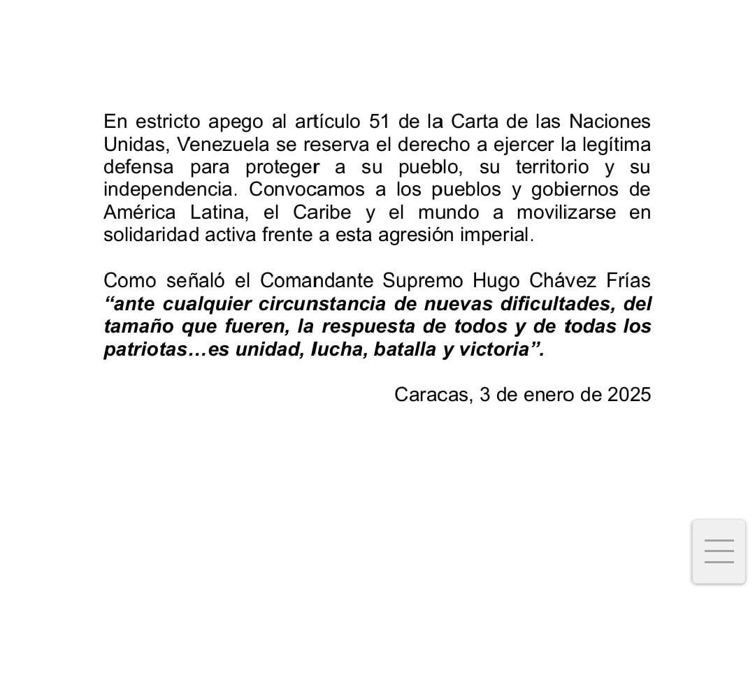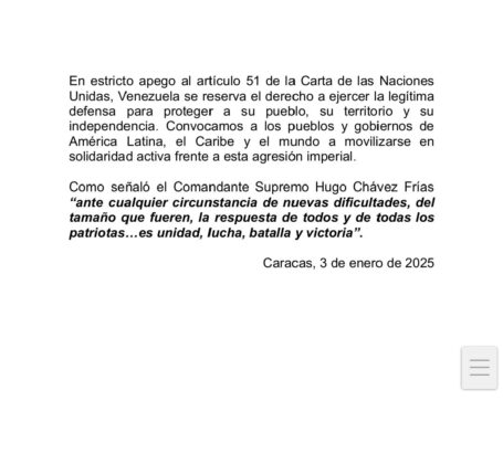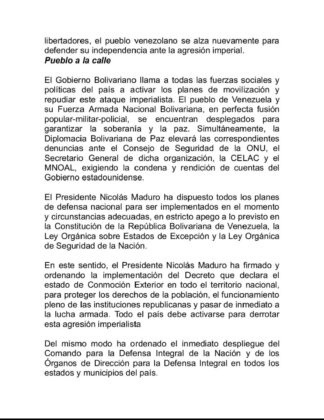 Il Governo Bolivariano invita tutte le forze sociali e politiche del Paese ad attivare piani di mobilitazione e a condannare questo attacco imperialista. Il popolo venezuelano e le sue Forze Armate Nazionali Bolivariane, in perfetta unità popolare-militare-poliziesca, sono schierati per garantire la sovranità e la pace. Contemporaneamente, la Diplomazia Bolivariana di Pace solleverà le relative denunce presso il Consiglio di Sicurezza delle Nazioni Unite, il Segretario Generale di tale organizzazione, la CELAC e il Movimento dei Paesi Non Allineati, chiedendo la condanna e la responsabilità del governo degli Stati Uniti.