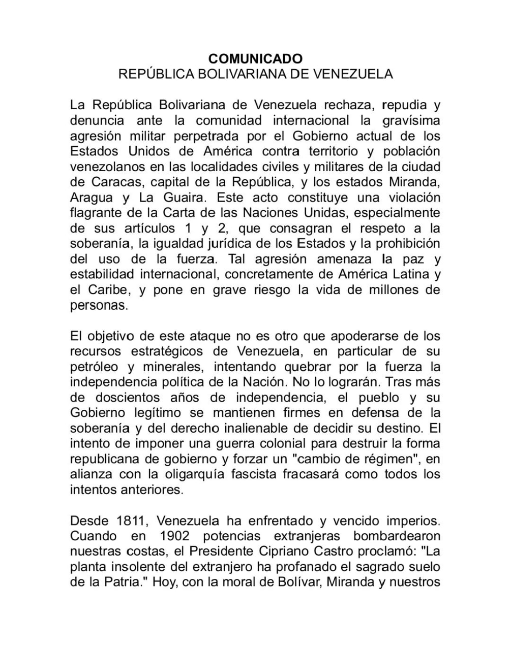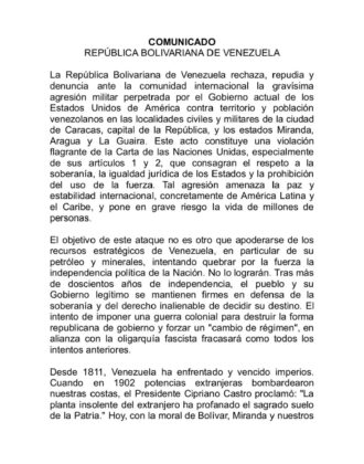 «L’obiettivo di questo attacco non è altro che impossessarsi delle risorse strategiche del Venezuela, in particolare petrolio e minerali, nel tentativo di spezzare con la forza l’indipendenza politica della nazione. Non ci riusciranno. Dopo oltre duecento anni di indipendenza, il popolo e il suo governo legittimo rimangono fermi nel difendere la propria sovranità e il diritto inalienabile a determinare il proprio destino. Il tentativo di imporre una guerra coloniale per distruggere la forma di governo repubblicana e forzare un “cambio di regime”, in alleanza con l’oligarchia fascista, fallirà, proprio come tutti i tentativi precedenti.
