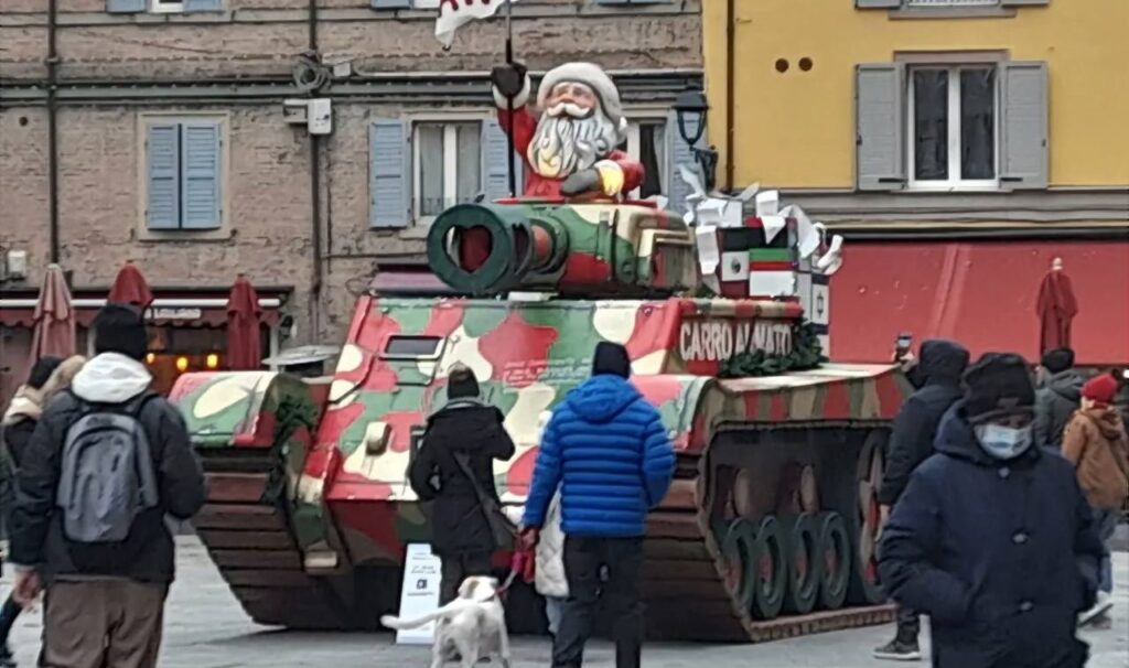Babbo Natale sopra al carro armato: a Modena proteste contro l’istallazione militarista