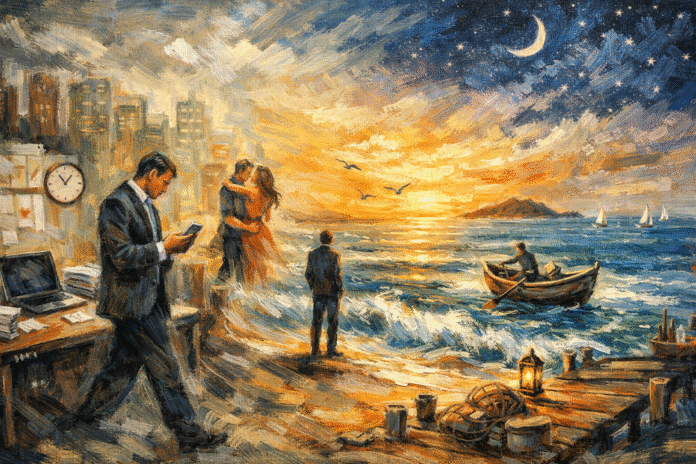 Dove manca il mare il tempo ha soltanto una direzione, appare come un succedersi lineare, articolato in scadenze, appuntamenti, compiti, incontri che si succedono; il lavoro scandisce le ore che restano a disposizione, il cellulare invade i nostri spazi, pretende e offre attenzione; l’amore stesso è figlio di un tempo determinato, sta lì e non altrove.