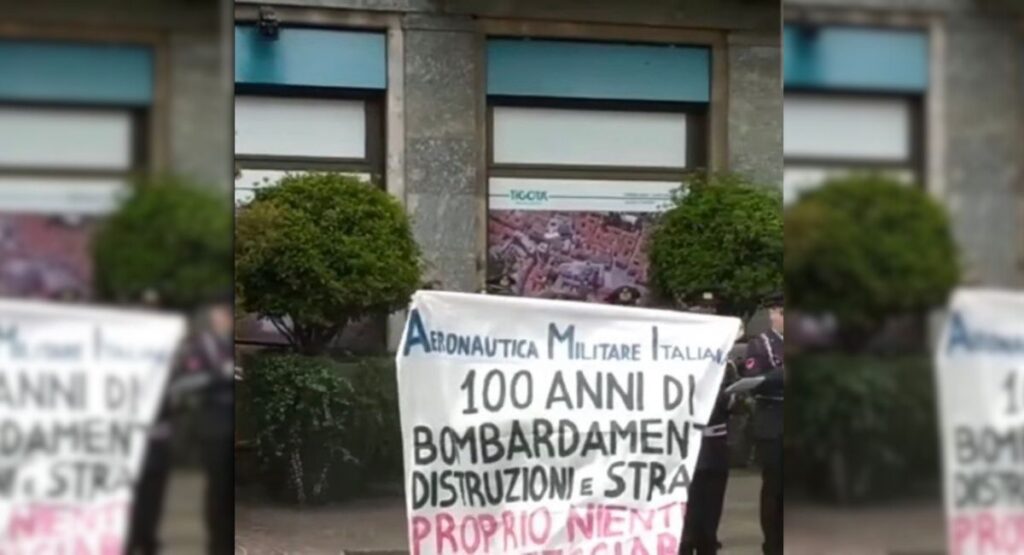 Durante il concerto della Fanfara per la celebrazione del centenario dell’aeronautica militare svoltosi a Gallarate, alcuni cittadini si sono posti davanti agli ufficiali che suonavano esponendo due striscioni. Il primo recitava “Aeronautica militare: 100 anni di bombardamenti, distruzioni e stragi. Proprio niente da festeggiare”, il secondo invece “No alla militarizzazione delle scuole”. I 7 manifestanti […]